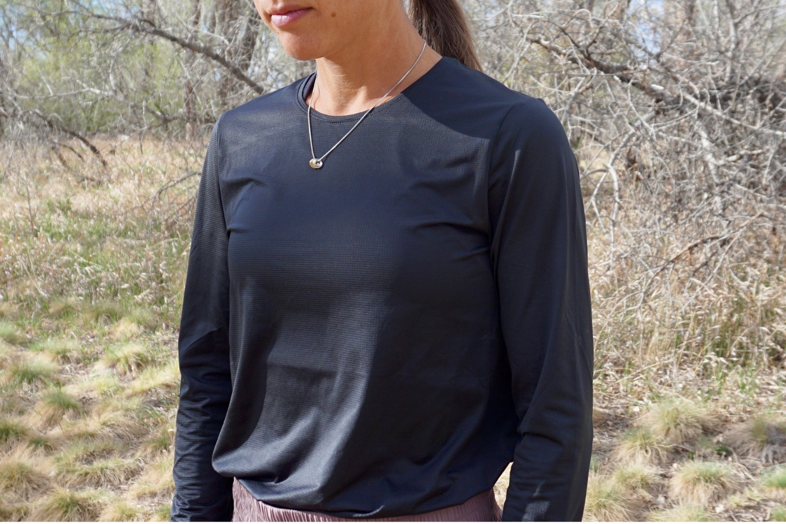 REESE: The weather is all over the place in Colorado this spring (summer? winter?) Which means having versatile running layers is essential. The Twilight Long Sleeve has been my go-to, do-it-all long sleeve. I’ve worn it on morning runs, midday in 40-degree temps, and horseback riding in 60-70 degree overcast days. It’s just protective enough to take the bite out of a chill on a cloudy, warmish day during a low-effort activity, but breathable enough to keep me from overheating on a run when the temperature swings from 40 to 60 degrees. This shirt didn’t hold on to moisture at all; it kept its smooth, silky texture. Minimal in design and lightweight, flowy fabrics make it a barely-there kind of shirt.