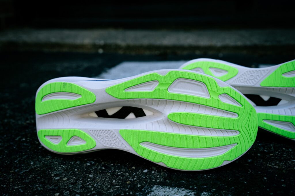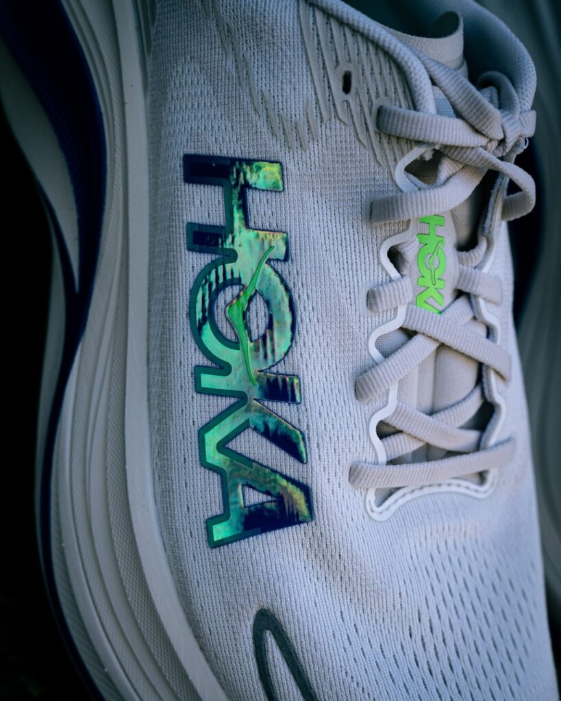 CHAD: One of my few complaints about the original Skyward X was the aesthetic and colorway that we were sent. It looked juvenile, and I’m pretty sure I likened it to a Playskool toy or “My First Super Trainer.” And while the form of the shoe looks very similar to the first version, the Skyward X 2 colorway we were sent is leaps and bounds better. Hoka has always seemed to embrace the glittery/mermaid aesthetic, and I think they really did well with the updated version, featuring a white upper and purpleish/greenish/bluish accents. Off to a good start right out of the box!