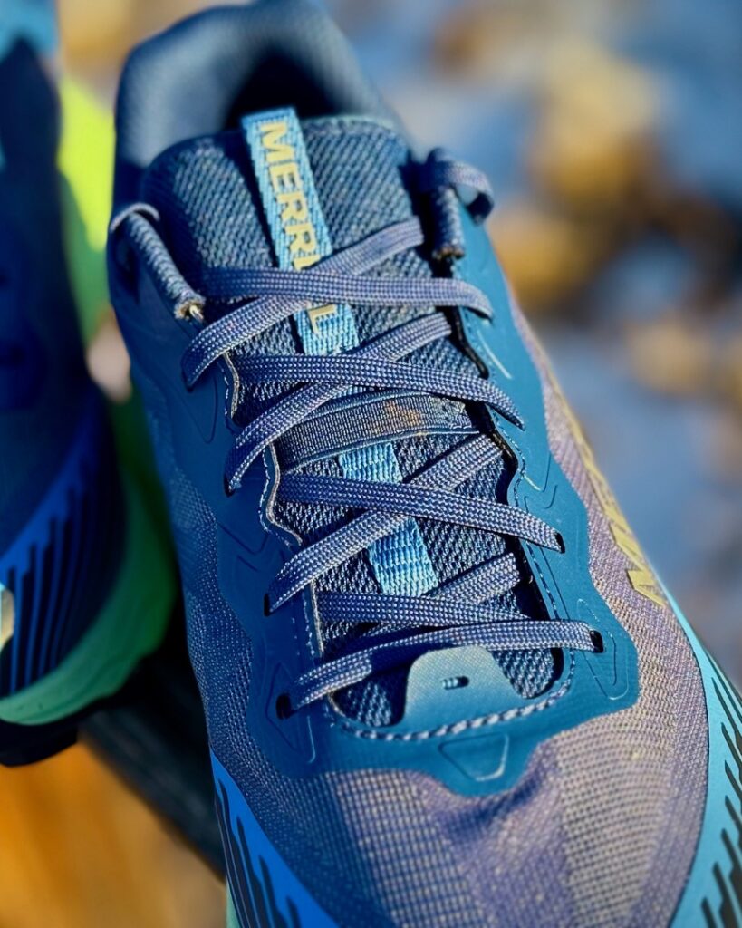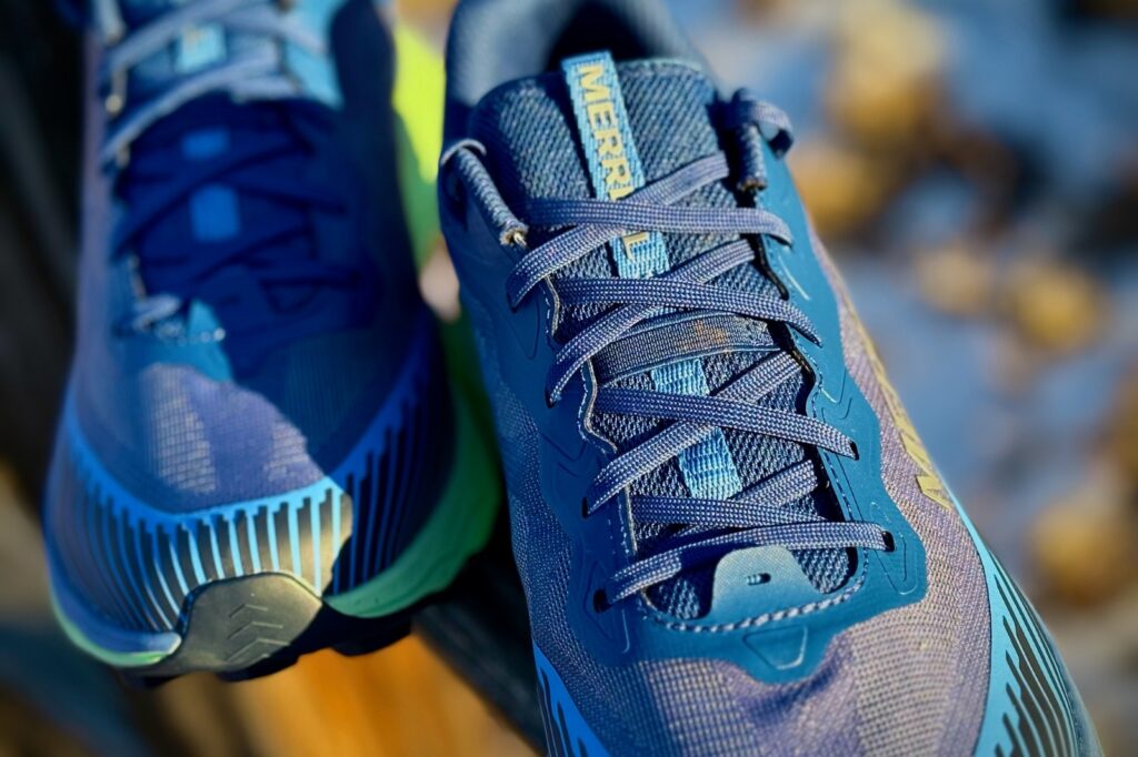REESE: The first thing I noticed about this shoe is the traction. The lugs, measuring 5 mm, are prominent. Merrell claims that these lugs increase traction by 25% and add stability and surface area by 50%. Because I can’t use a lab or even compare this shoe to the previous one, that claim is hard to validate, but the shoes are indeed super great at running up or down rocks/non-flowy trail or paved surfaces. Merrell opted for a web-like outsole pattern, shedding some weight from the shoe. However, we’ll get to some drawbacks of the outsole in the next section.